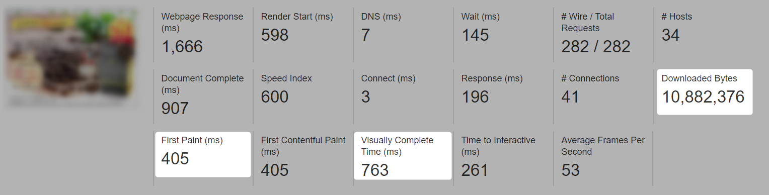 ECサイトなので、綺麗な画像を多用して10MBのサイズがありますが、表示開始0.405秒、表示完了0.763秒です。